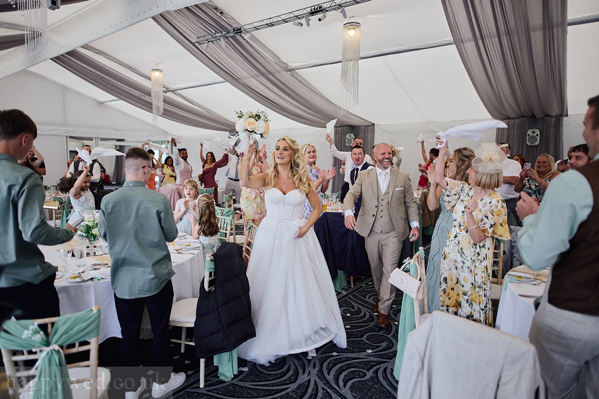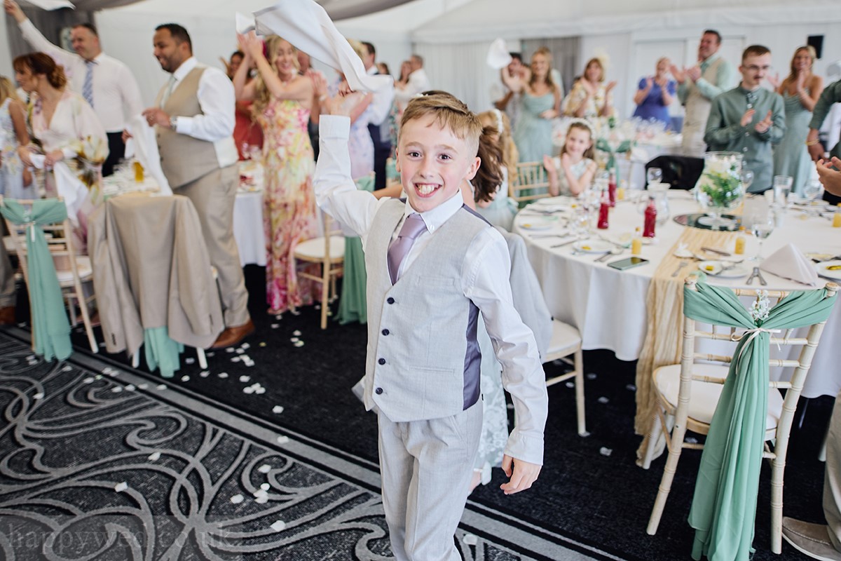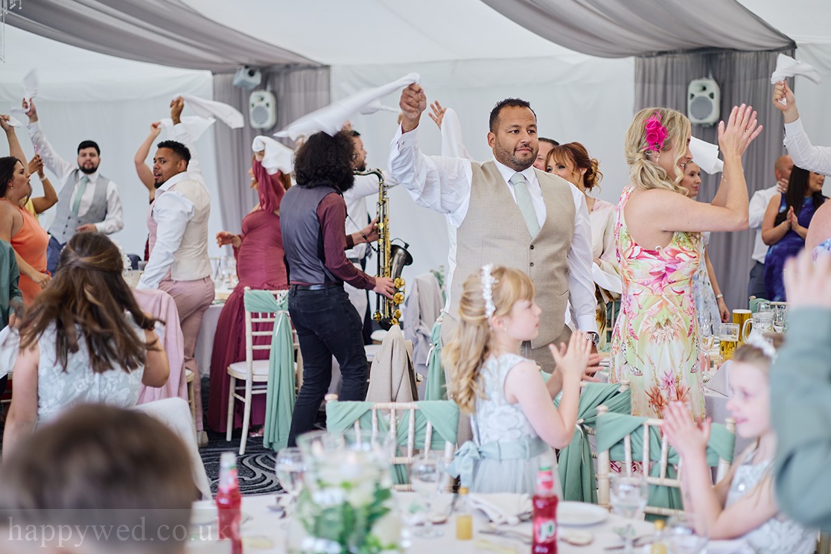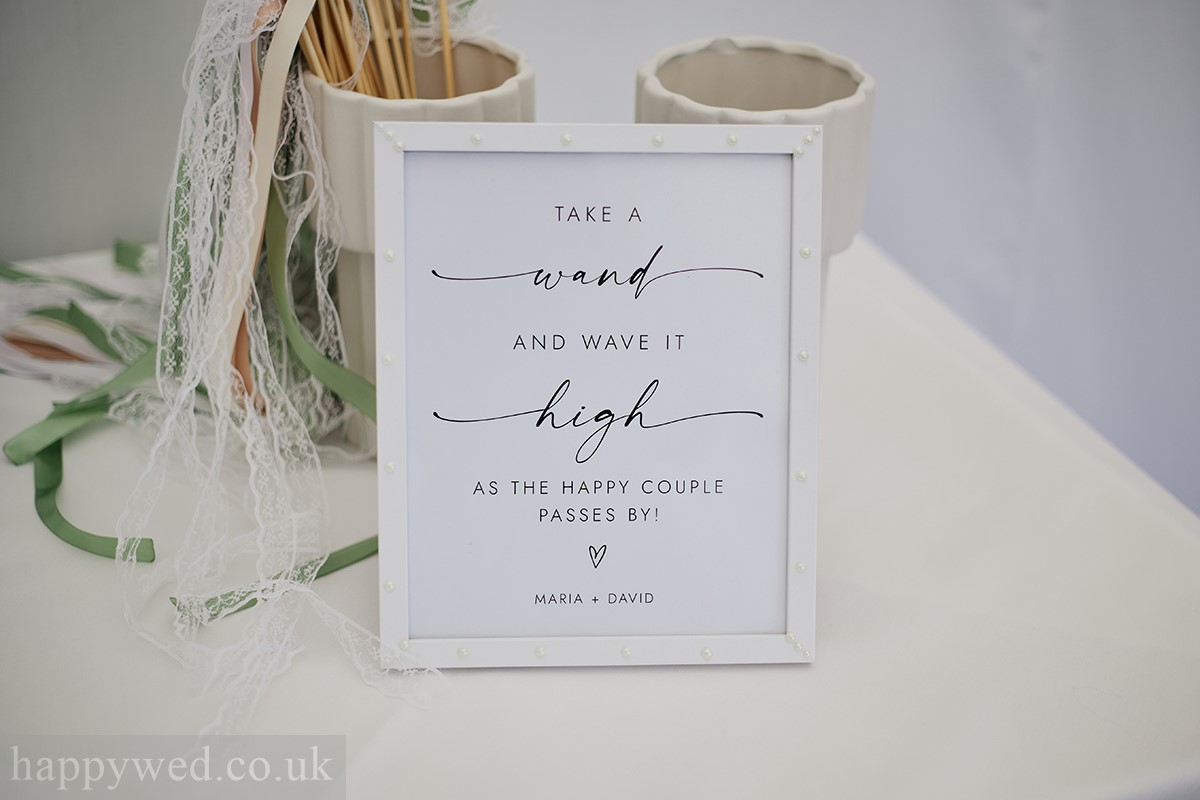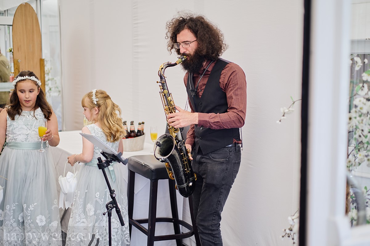 The windy weather proved ideal for magic wand photos, a better choice than confetti, which Maria made herself. The chilly wind also didn’t stop us from taking group shots outdoors before the wedding breakfast. The bride and groom made an unforgettable saxophone-accompanied entrance to their wedding breakfast.