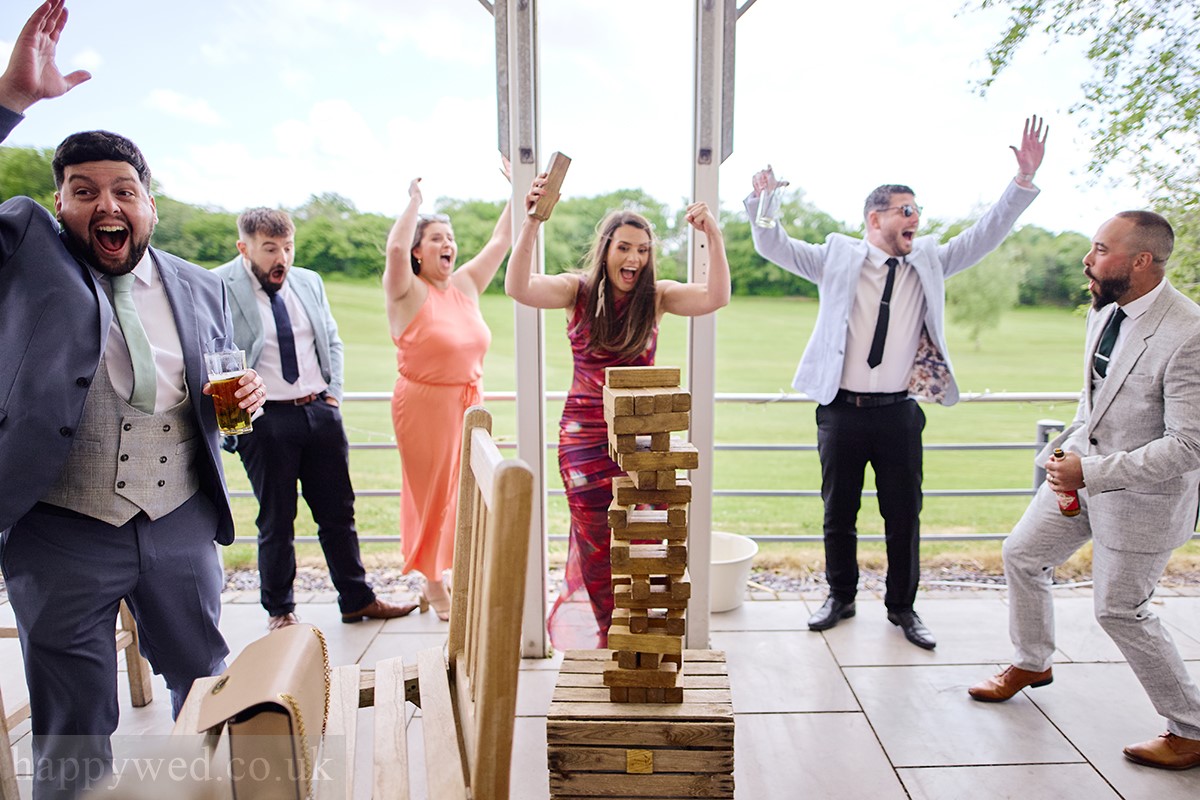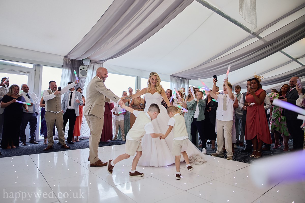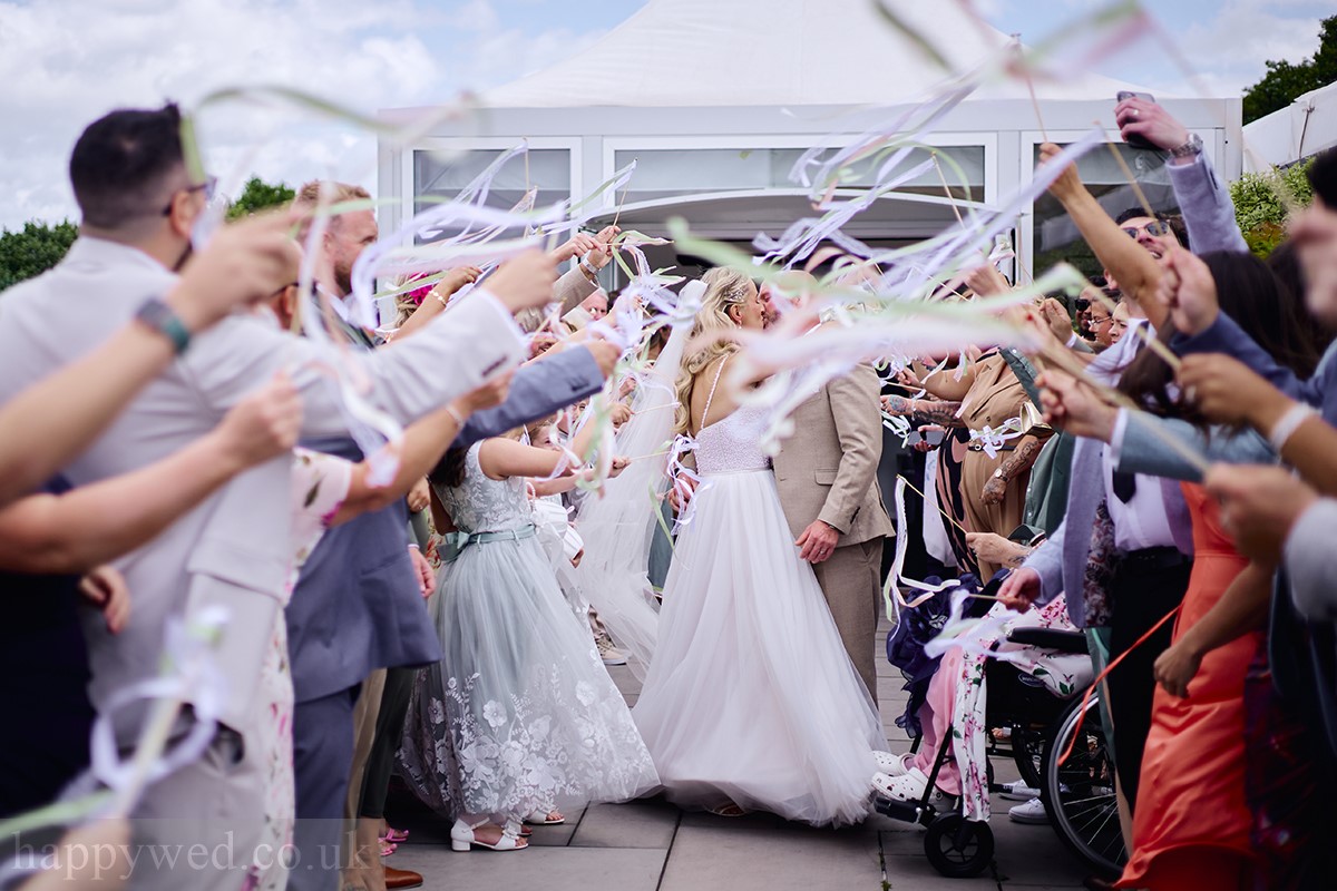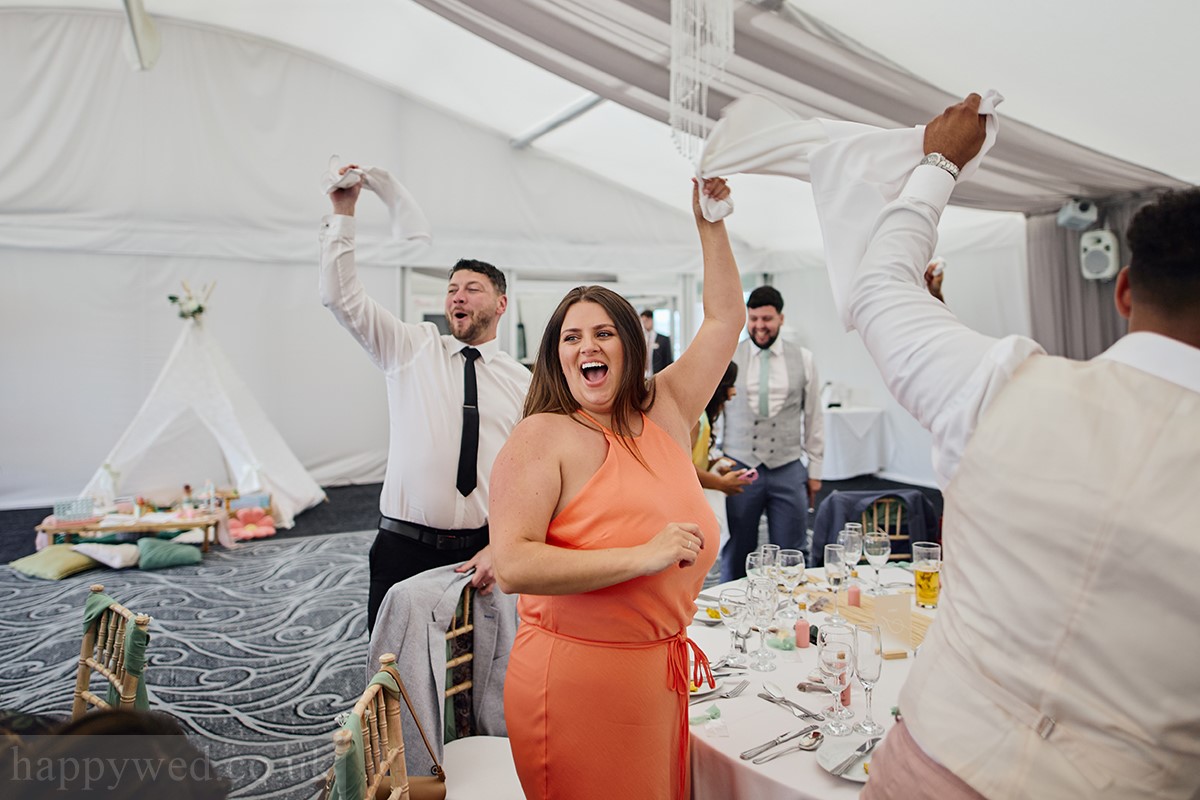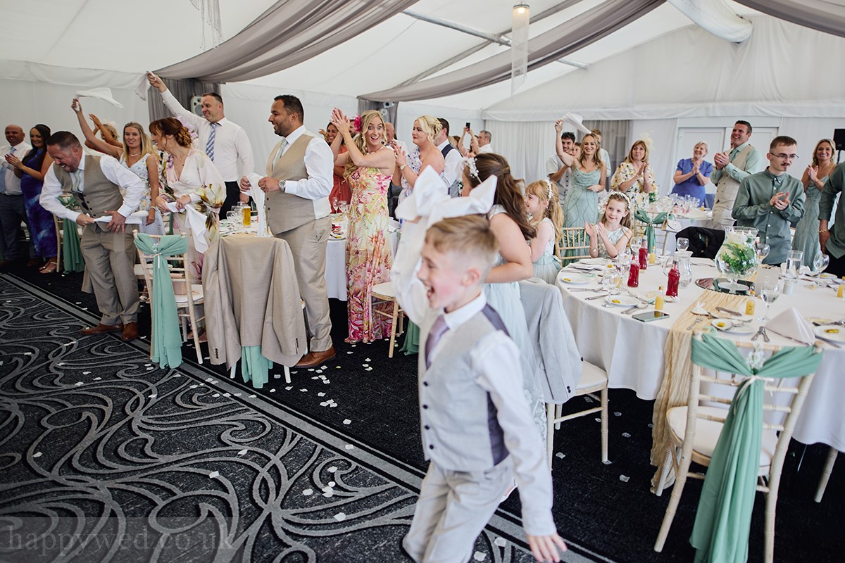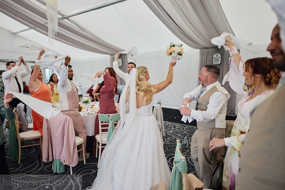 The windy weather proved ideal for magic wand photos, a better choice than confetti, which Maria made herself. The chilly wind also didn’t stop us from taking group shots outdoors before the wedding breakfast. The bride and groom made an unforgettable saxophone-accompanied entrance to their wedding breakfast.